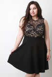 A floral lace back. Finished with a textured flared skirt. Accessories sold separately. Made in U.S.A. Self: 95% Polyester, 5% Spandex. Contrast: 97% Nylon, 3% Spandex.