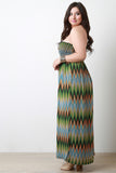 This plus size maxi dress features a zig zag pattern print, runched elasticized tube neckline, and flowy bottom. Accessories sold separately. Made in U.S.A. 95% Polyester, 5% Spandex.