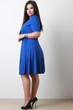 This plus size dress features a wrap inspired design with a surplice neckline, elbow sleeves, ties at waist, and midi-length flare skirt with overlapping front. Accessories sold separately. Made in U.S.A. 93% Rayon, 7% Spandex.