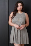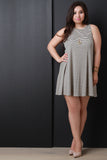 This cute plus size dress features a sleeveless design, high rounded neckline, back cut out, flare hem, and a light weight rib knit fabrication. Accessories sold separately. 97% Rayon 3% Spandex.
