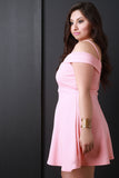 This p lus size dress features a structure off shoulder bardot neckline, spaghetti shoulder straps, textured knit fabrication, and cinched high waist seam. Accessories sold separately. Made in U.S.A. 95% Polyester, 5% Spandex.