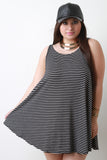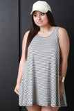 This plus size sleeveless dress features a soft jersey knit fabrication with stripe print throughout, scoop neckline, and flowy shift cut fit. Accessories sold separately. Made in U.S.A. 95% Rayon, 5% Spandex.