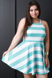 This glamorous fit & flare dress features a beautiful striped knit fabrication, high neck, and sleeveless design with fixed spaghetti shoulder straps. Finished with a mini-length circle skirt. Partially lined. Accessories sold separately. Shell: 93% Polyester, 7% Spandex. Lining: 100% Polyester.