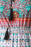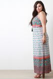This chic plus size dress features a stretchy patterned print fabrication, round neckline, spaghetti straps, and keyhole cutouts with a faux drawstring closure. Finished with a cinched waist and maxi-length hem. Accessories sold separately. Made in U.S.A. 90% Polyester, 10% Spandex.