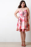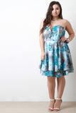 This plus size fit & flare floral print fabrication, split sweetheart neckline with v-shaped boning, pleated waistline, and finished with double-front layered flare skirt. Accessories sold separately. Made in U.S.A. 96% Polyester, 4% Spandex.