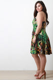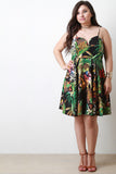 This plus size fit & flare dress features a tropical print fabrication, split sweetheart neckline with v-shaped boning, soft padded cups, spaghetti shoulder straps, and flare skirt. Accessories sold separately. Made in U.S.A. 96% Polyester, 4% Spandex.