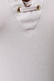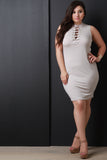 This sleeveless plus size dress features a mock neck, keyhole back with button closure, metallic grommets with corset-style lace-up design at front, and stretchy sculpture fit. Accessories sold separately. Made in U.S.A. 95% Polyester, 5% Spandex.