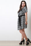 This plus size dress features a printed woven knit fabrication, round neckline with chains and fringe details, short sleeves, side pockets, and self-tie waist sash. Accessories sold separately. 100% Polyester.