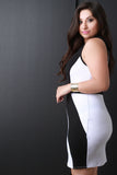 This plus size bodycon dress features textured knit, color block design, v-neck, semi-sheer mesh panel, and mini length. Accessories sold separately. 97% Polyester, 3% Spandex.