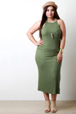 This plus size dress features a ribbed knit fabrication, halter neckline, sleeveless fit, and a strap detail at back. Finished with a maxi-length hemline and side slit. Accessories sold separately. Made in U.S.A. 96% Rayon, 4% Spandex.
