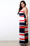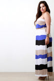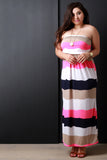 This plus size dress features a multicolor stripes print pattern, strapless tube top, empire waist construction, and maxi-length hemline. Accessories sold separately. Made in U.S.A. 90% Polyester, 10% Spandex.