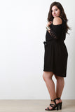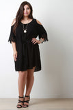 This lovely plus size dress features a scoop neckline, crochet trim elbow sleeves with cold shoulder cutouts, and self-tie sash at waist. Accessories sold separately. 100% Rayon.
