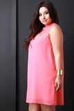 This plus size dress features a flowy chiffon fabrication with contrasting floral lace on shoulders, flat collar with hook closure, front keyhole and sleeveless fit. Finished with a mini-length hemline and lining. Accessories sold separately. 100% Polyester.