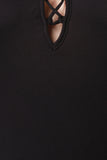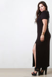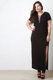 This plus size maxi dress features a soft knit fabrication, lace up deep v neckline, short sleeves, and a thigh high side slit. Accessories sold separately, Made in U.S.A. 95% Rayon, 5% Spandex.