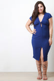 This sexy plus size dress features a rib knit fabrication, short sleeves, a deep v neckline with a twisted detail an keyhole opening, slim curve hugging silhouette, midi length hemline and a high center front slit. Accessories sold separately. Made in U.S.A. 57% Rayon, 38% Polyester, 5% Spandex.