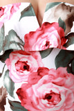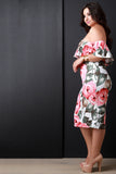 This plus size dress features a textured knit fabrication, rosette print design, ruffled off-the-shoulder neckline with v-wire inset, and finished with a midi-length hemline. Accessories sold separately. Made in U.S.A. 96% Polyester. 4% Spandex.