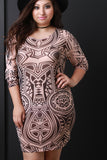 This plus size bodycon dress features a round neckline, long sleeves, mini length hemline, and tribal pattern print on semi-sheer mesh fabrication. Accessories sold separately. Made in U.S.A. 92% Polyester, 8% Spandex.