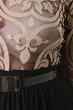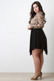 This plus size dress features a knit fabrication, semi sheer burnout mesh lace top, with a solid contrast skirt, scoop neckline, long sleeves, and an asymmetrical pointed mini length hem line. Belt included, Other accessories sold separately. 90% Polyester 10% Spandex.