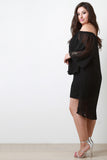 This plus size dress features an elasticized off-the-shoulder neckline with an adjustable shoulder straps, long bell sleeves design, popover silhouette, and finished with side slits. Accessories sold separately. 50% Polyester, 50% Rayon.