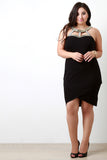This stylish plus size dress features a stretchy knit fabric, gold and crystal trimmed, caged yoke construction, halter-style neckline, and sleeveless fit. Finished with a button hook closure at nape and asymmetrical hemline. Accessories sold separately. Made in U.S.A. 67% Viscose, 28% Nylon, 5% Spandex.