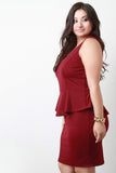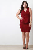 This plus size sleeveless mini dress features a rounded v-neckline, strappy open back construction, peplum detail at waist, and stretchy bodycon fit. Partially lined. Accessories sold separately. 96% Polyester, 4% Spandex.