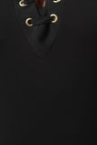 This lace up detail with grommets at front, keyhole back with button closure at nape, sleeveless design, and stretchy bodycon fit. Accessories sold separately. Made in U.S.A. 65% Rayon, 30% Nylon, 5% Spandex.