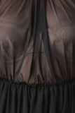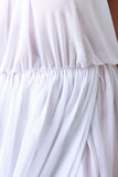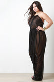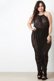 This plus size dress features a round neckline with an attached layered necklace, open back construction, halter chain closure at nape. Finished with a cinched waistline, front draped design, and asymmetrical maxi-length hem. Other accessories sold separately. Made in U.S.A. 95% Polyester, 5% Spandex.
