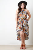 This plus size dress features a round neckline, cutaway sleeveless design, elasticized cinched waist, highlighted with a patent bow belt, high low hemline, and floral pattern print. Accessories sold separately. Made in U.S.A. 100% Polyester.