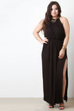 This plus size dress features soft jersey knit, spaghetti straps, ruched elasticized waist, side slit, and maxi length. Accessories sold separately. Made in USA. 95% Rayon, 5% Spandex.