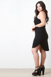 This plus size dress features soft rib knit, round neckline, spaghetti straps, and slight high-low hem. Finished with choker. Accessories sold separately. Made in USA. 92% Polyester, 8% Spandex.
