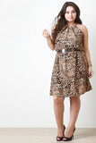 This gorgeous plus size dress features a chiffon fabrication with cheetah print throughout, round neckline, pleated detail at front, and button closure at nape. Finished with a removable plated vegan leather belt and cinched waistline. Other accessories sold separately. 100% Polyester.