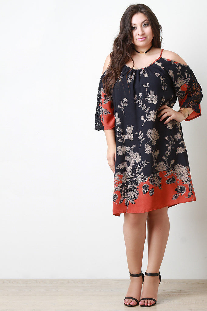 This chic plus size shift dress features a cold shoulder design, crochet lace sleeve inset, spaghetti straps, back tie, two tone floral print pattern scoop neckline with gather detail and a low cut back. three quarter length bell sleeves, and a knee length hemline. Accessories sold separately. 100% Polyester.