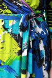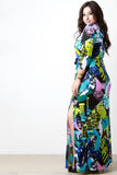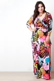 This eye-catching plus size dress features a smooth stretchy knit, urban graffiti print pattern, three quarter sleeves, surplice neckline, and front slit. Finished with a maxi-length hemline and self-tie waist sash. Accessories sold separately. Made in U.S.A. 95% Polyester, 5% Spandex.