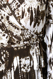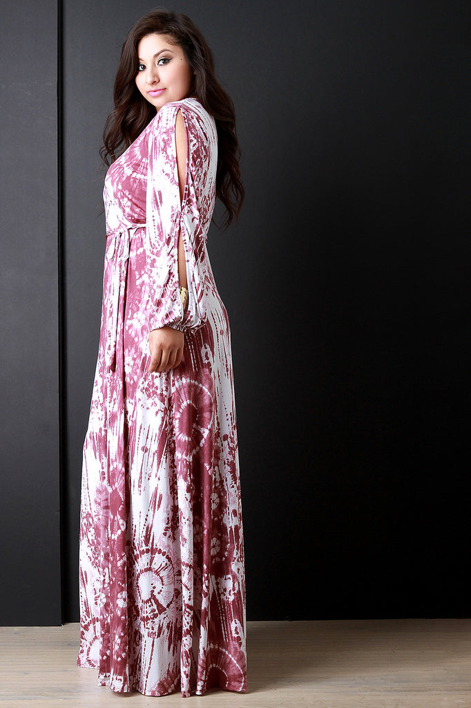This beautiful plus size dress features a smooth stretchy knit fabric, splattered tie dye print, surplice wrap construction with self-tie waist sash, and slit-detailed long sleeves. Finished with a maxi-length hemline. Accessories sold separately. Made in U.S.A. 95% Polyester, 5% Spandex.
