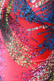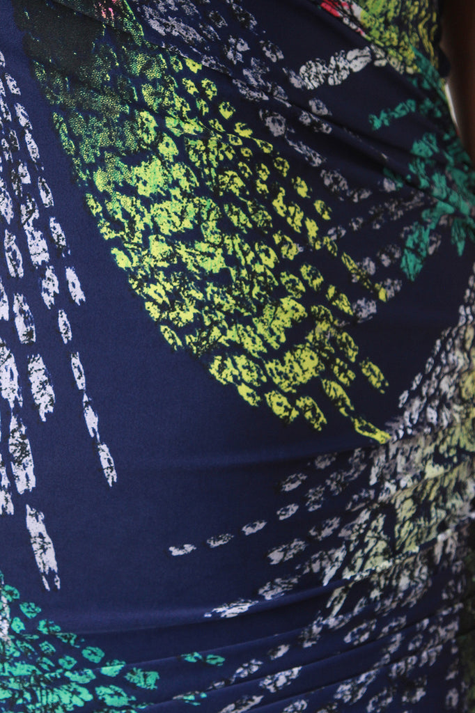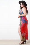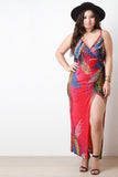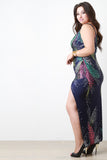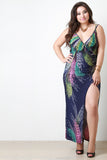 This plus size maxi dress features a surplice v-neckline, double shoulder straps, sculpture fit, left leg vent slit, and pattern print. Accessories sold separately. Made in U.S.A. 95% Polyester, 5% Spandex.