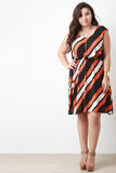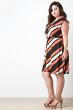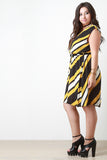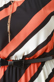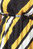 This fun plus size dress features a light chiffon fabrication, multi colored stripe pattern, scoop neckline, lined skirt, elastic waist, and a faux patent leather bow belt included. Other accessories sold separately. 100% Polyester.
