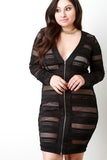 This bodycon plus size dress features a lace hole patterned fabric, deep v-neckline with front zip-up closure, and longsleeves construction. Finished with a midi-length hemline. Accessories sold separately. Made in U.S.A. Self: 90% Nylon, 10% Spandex. Contrast: 95% Polyester, 5% Spandex.