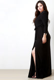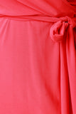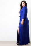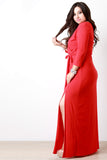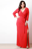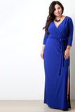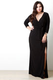 This plus size maxi dress features a smooth stretchy knit fabric, surplice neckline, faux wrap construction with self-tie waist sash, quarter sleeves, and front slit. Accessories sold separately. Made in U.S.A. 95% Polyester, 5% Spandex.