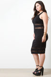 This plus size dress features a mesh yoke with a round neckline and sleeveless design. Designed with mesh accents along the waist and hem. Stretchy soft knit, unlined. Finished with a zipper at back. Accessories sold separately. Self: 68% Rayon, 29% Nylon, 3% Spandex. Contrast: 95% Polyester, 5% Spandex.