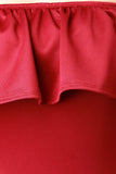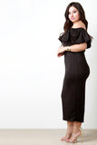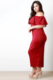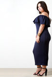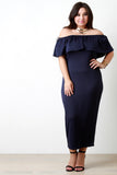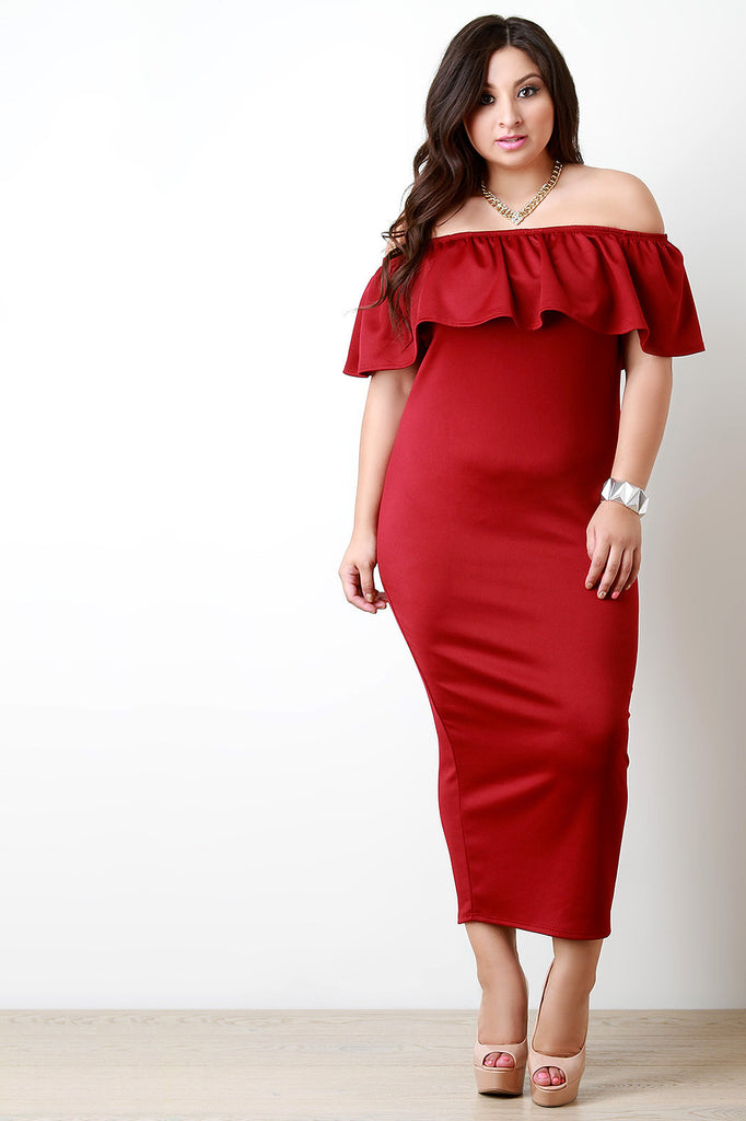 This casual plus size dress features a smooth stretchy knit fabric, elasticized off the shoulder neckline with a layered ruffle detail, and maxi-length hemline. Accessories sold separately. Made in U.S.A. 95% Polyester, 5% Spandex.