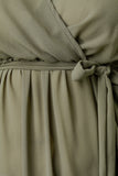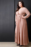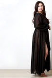 This daring plus size maxi dress features a semi-sheer chiffon fabric, surplice neckline, elasticized waist with self-tie sash, front high slit, and cuffed longsleeves. Accessories sold separately. Made in U.S.A. 100% Polyester.