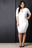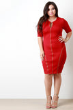 This fashion-forward plus size dress features a three-way zipper trim construction, elbow sleeves, round neckline, and midi-length hemline. Accessories sold separately. 95% Polyester, 5% Spandex.
