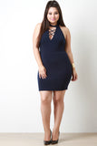 This plus size bodycon dress features a mock neckline, crisscross caged yoke, sleeveless design, wide seam cinched waist, mini length hem, and hidden zipper fastener at back. Accessories sold separately. Made in U.S.A. 92% Polyester, 8% Spandex.