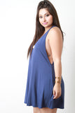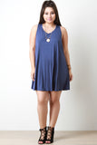 This plus size dress features a soft jersey knit fabrication, side cutout sleeveless design, round neckline, single button closure at nape, large keyhole back, and swing cut fit. Accessories sold separately. Made in U.S.A. 92% Rayon, 8% Spandex.
