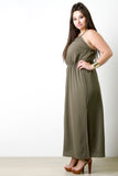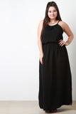 This plus size maxi dress features a woven fabric, halter neckline, lace back detail, and sleeveless construction. Finish with two side slits and cinched elasticized waist. Accessories sold separately. Made in U.S.A. 100% Polyester.