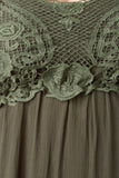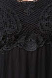 This plus size dress features a woven fabric, crochet yoke design, thin shoulder straps, open back, and handkerchief hemline. Accessories sold separately. Made in U.S.A. 100% Rayon.