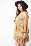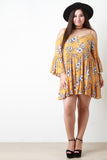 This plus size mini dress features a woven fabrication, floral print pattern, cold shoulder cut out, adjustable spaghetti straps, long bell sleeves, tiered ruffle design, with a crochet dot trim set in to the waist seam. Accessories sold separately. 100% Rayon.