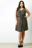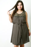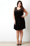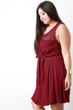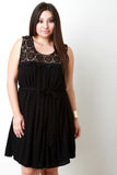 This plus size dress features a floral crochet yoke with contrasting crinkled woven fabric, scoop neckline, and sleeveless fit. Finished with a mini-length hemline, self-tie waist sash, and partial lining. Accessories sold separately. Made in U.S.A. 100% Rayon.