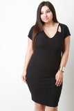 This plus size bodycon dress features a v-neckline, front cutout detail, strappy open back construction, short sleeves, and stretchy bodycon fit. Accessories sold separately. Made in U.S.A. 92% Polyester, 8% Spandex.