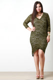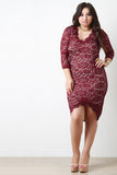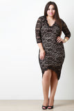 This plus size dress features a stretch lace fabrication, V neckline, half sleeves, curve hugging bodycon fit, full lining, and a high low hemline. Accessories sold separately. Shell: 95% Polyester 5% Spandex. Lining: 100% Polyester.